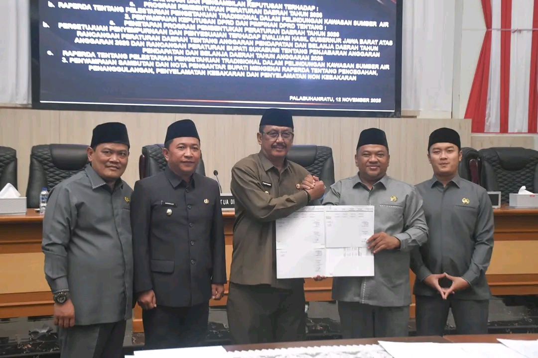- Penyampaian keputusan DPRD dan pimpinan DPRD tentang penetapan program pembentukan peraturan daerah tahun 2026, persetujuan penyempurnaan dan penyesuaian terhadap evaluasi hasil Gubernur Jawa Barat atas Raperda tentang Anggaran Pendapatan dan Belanja Daerah tahun anggaran 2026 dan Rancangan Peraturan Bupati Sukabumi tentang penjabaran APBD 2026, serta Raperda tentang pelestarian pengetahuan tradisional dalam pelindungan kawasan sumber air.