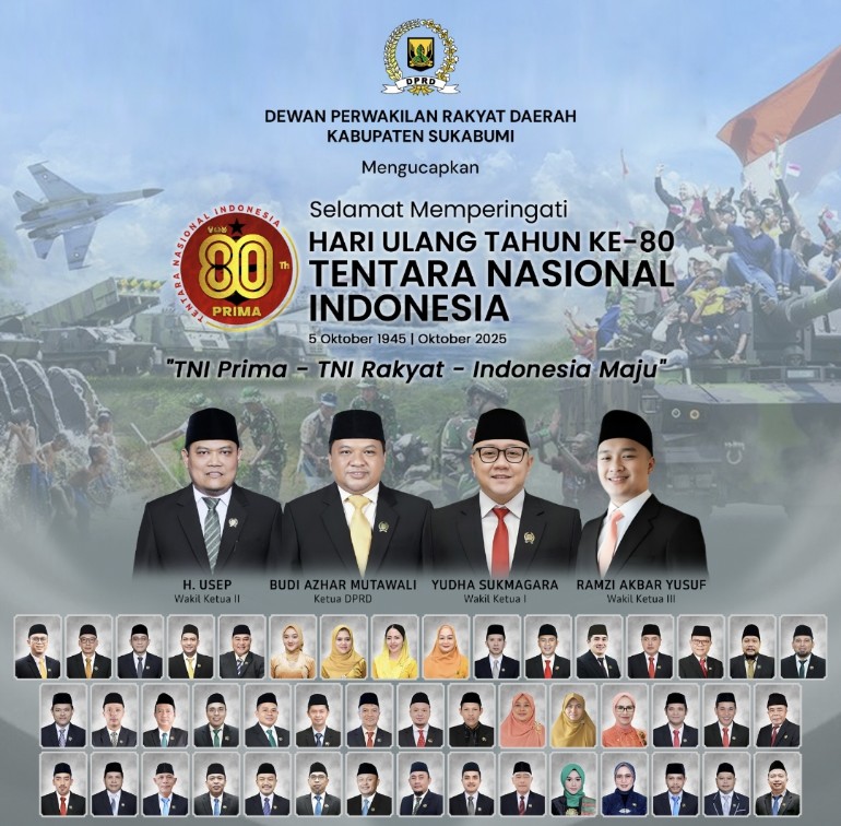 Seluruh keluarga besar DPRD Kabupaten Sukabumi Jawa Barat, mengucapkan SELAMAT HARI ULANG TAHUN TNI ke-80 tahun 2025. “TNI PRIMA, TNI RAKAT, INDONESIA MAJU”