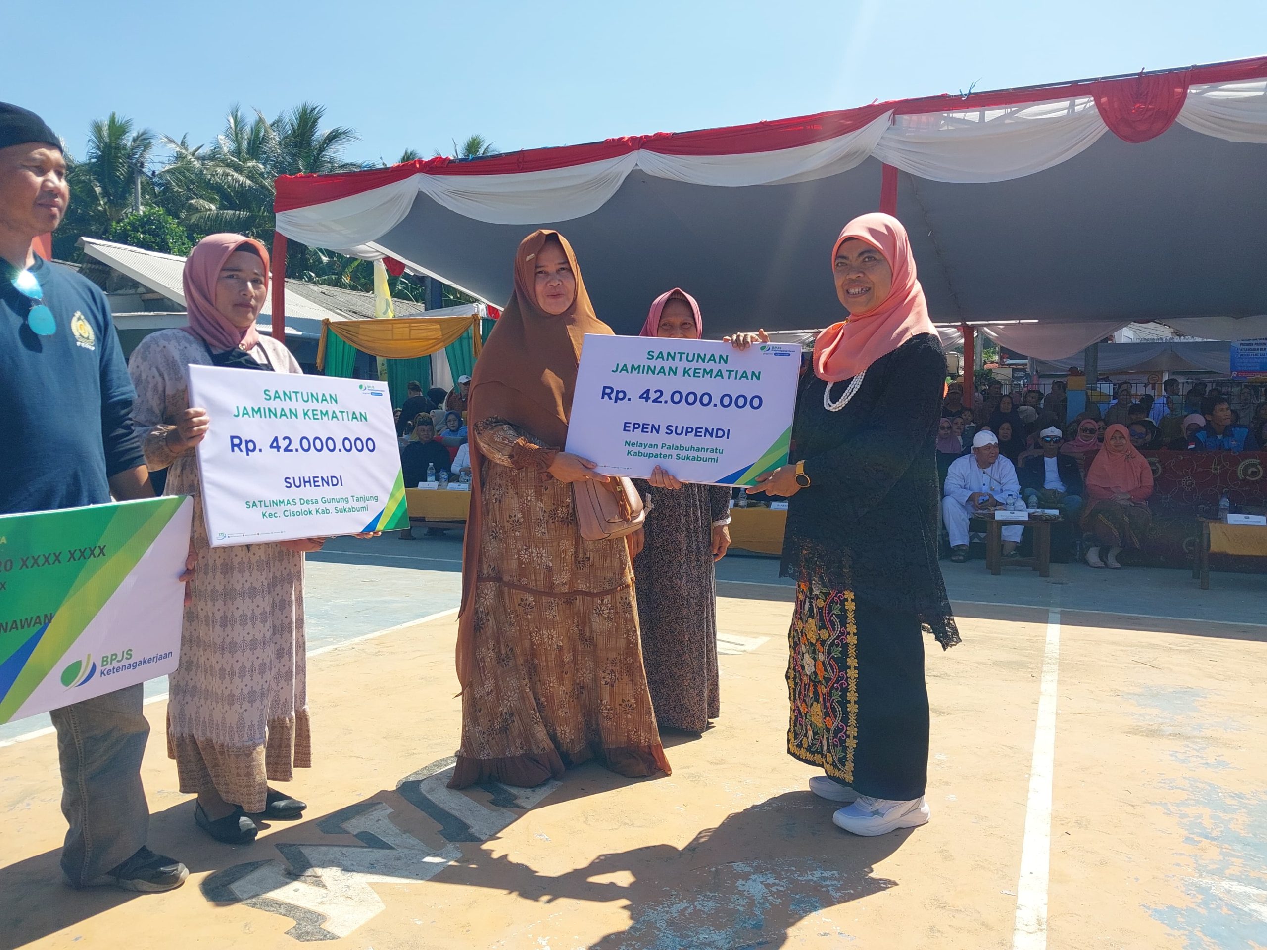Parametermedia. com- Kepala Dinas Perikanan Kabupaten Sukabumi Nunung Nurhayati bersama Kepala BPJS Ketenagakerjaan memberikan santunan jaminan kematian secara simbolis kepada ahli waris. Hal itu dilakukan pada acara syukuran Hari Nelayan Cisolok Ke-28: Kamis, 11 Juli 2025 di TPI Cisolok, Kecamatan Cisolok