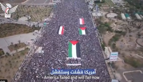 Tangkapan layar ribuan orang di Yaman dukung Palestina