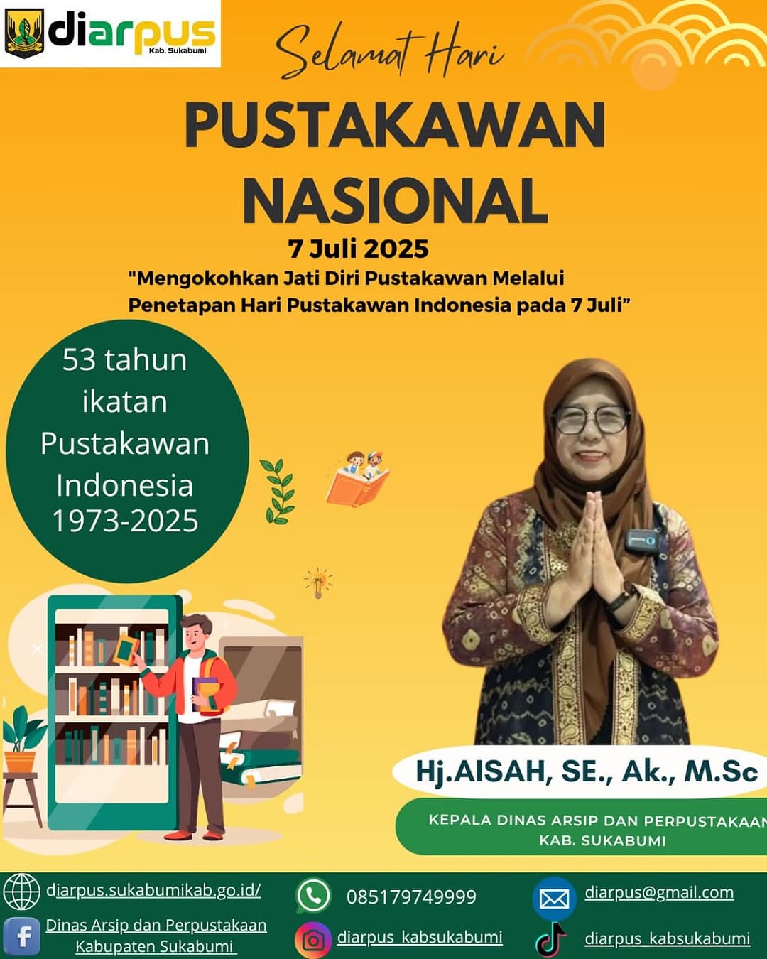 Parametermedia. com- Kepala Dinas Arsip dan Perpustakaan Kabupaten Sukabumi, Hj. Aisah menyampaikan ucapan Selamat Hari Pustakawan Nasional yang diperingati setiap tanggal 07 Juli.