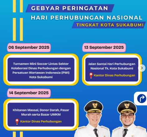 PARAMETERMEDIA.COM – Untuk memeriahkan Hari Perhubungan Nasional (Harhubnas) 17 September 2025, Dinas Perhubungan (Dishub) Kota Sukabumi akan menggelar sejumlah rangkaian kegiatan.
