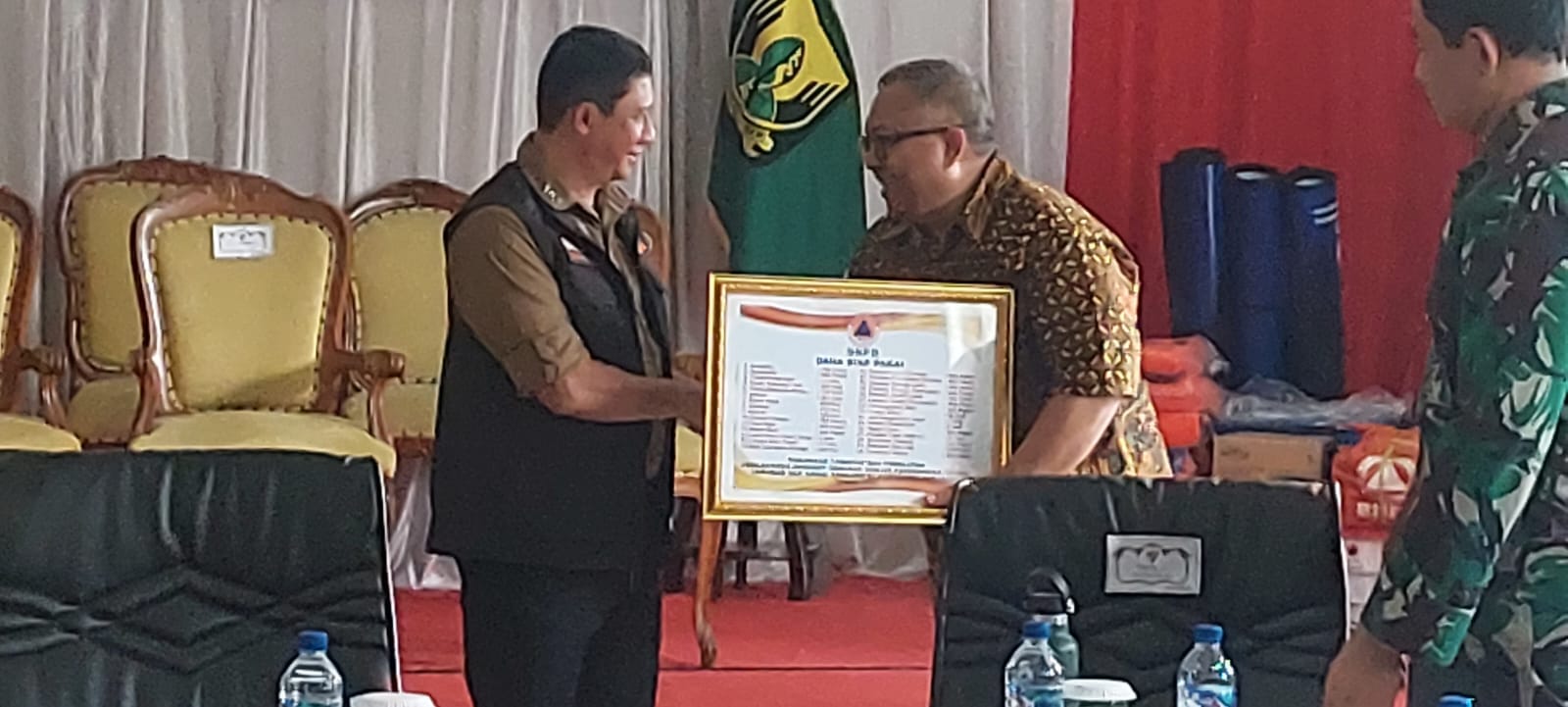 Dipenghujung acara dilaksanakan penyerahan secara simbolis bantuan logistik dan peralataan tahap dua dari kepala BNPB Letjen TNI, Suharyanto kepada Bupati Sukabumi H. Marwan Hamami didampingi Pj Gubernur dan Sekda Jabar. *